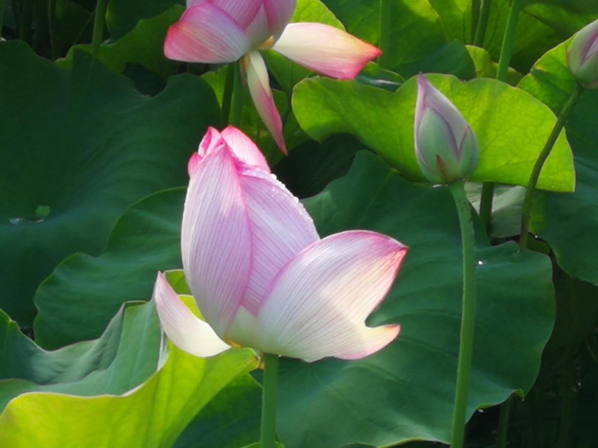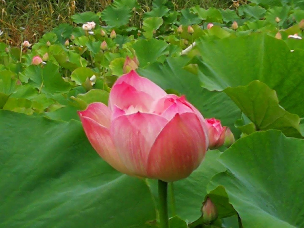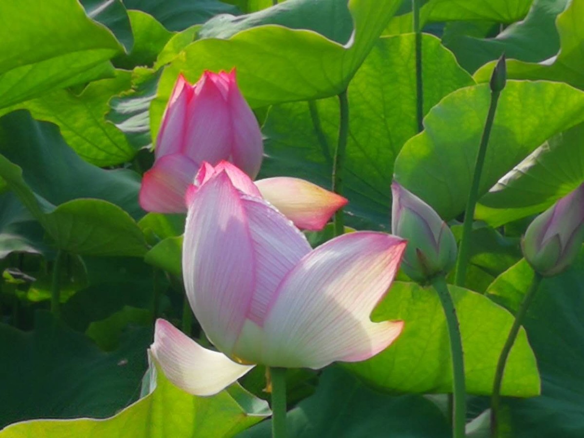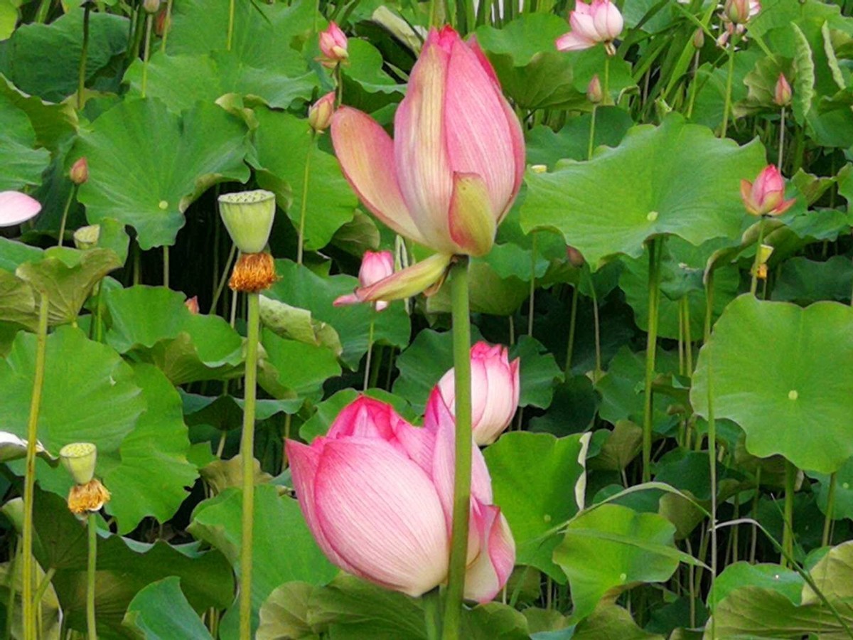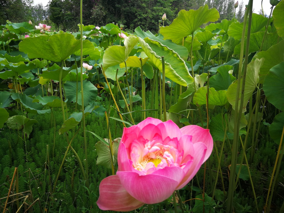 这段时间,在西昌邛海湿地,成片荷花争相绽放,远远看去,绿叶铺满湿地边缘,一朵朵荷花从期间冒出,有的已完全盛开,颜色靓丽,引来蜜蜂采蜜,有的含苞待放,粉嫩粉嫩惹人怜,已经凋谢的荷花,露出一个个莲蓬。