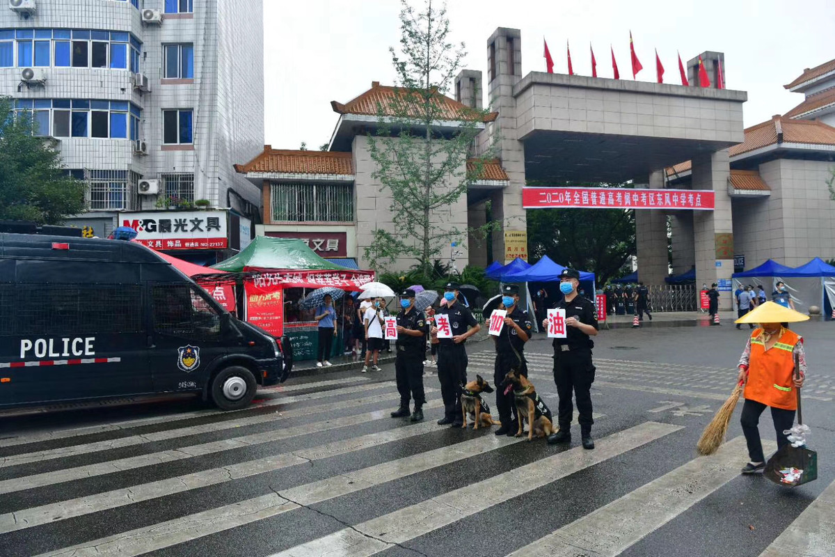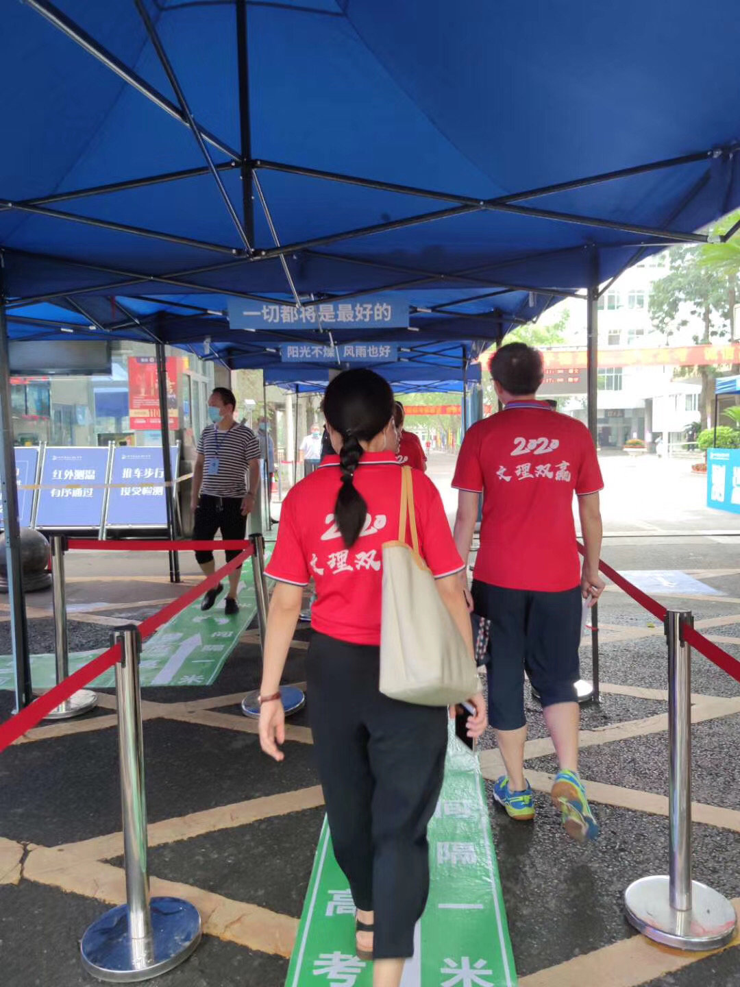 “所有考生、考试工作人员经过体温检测,方可进入考场。”7月7日,天降小雨,南充高中嘉陵校区考点外,考场工作人员已经在设置好的凉棚和体温异常临时隔离观察区等待考生入场。在经过长达数月的网课学习后,4.4万名高考考生戴着口罩,走进考场。