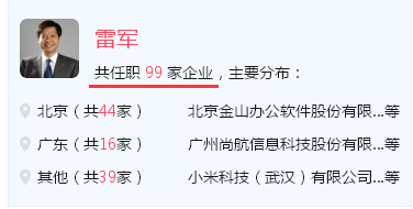 企查查显示,雷军共任职99家企业。其中,最受关注的就是小米科技。