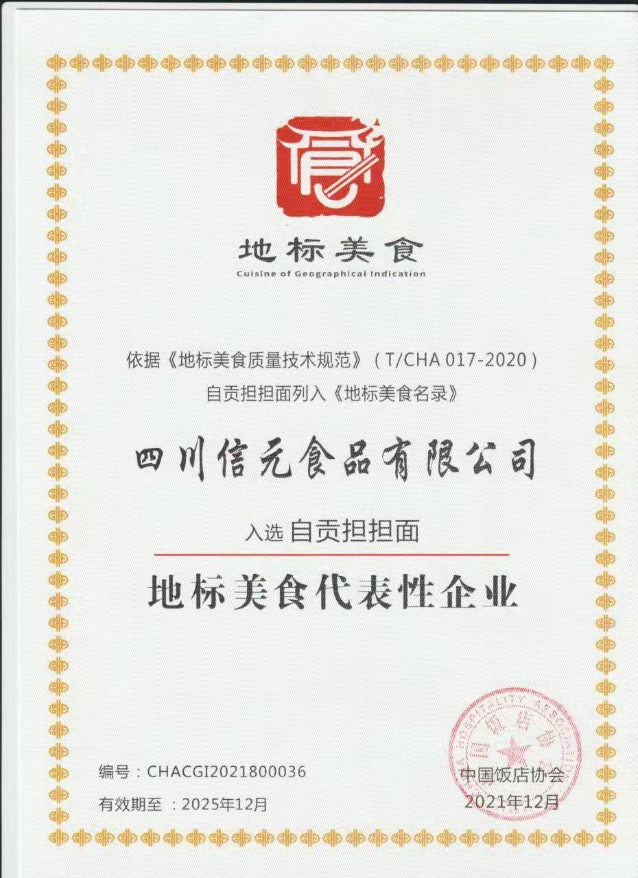 2月22日,经四川省食品文化研究会推荐,中国饭店协会批准,自贡担担面成为国家“地标美食”、四川信元食品有限公司为“地标美食代表性企业”、冯文浩为“地标美食代表性传承人”。