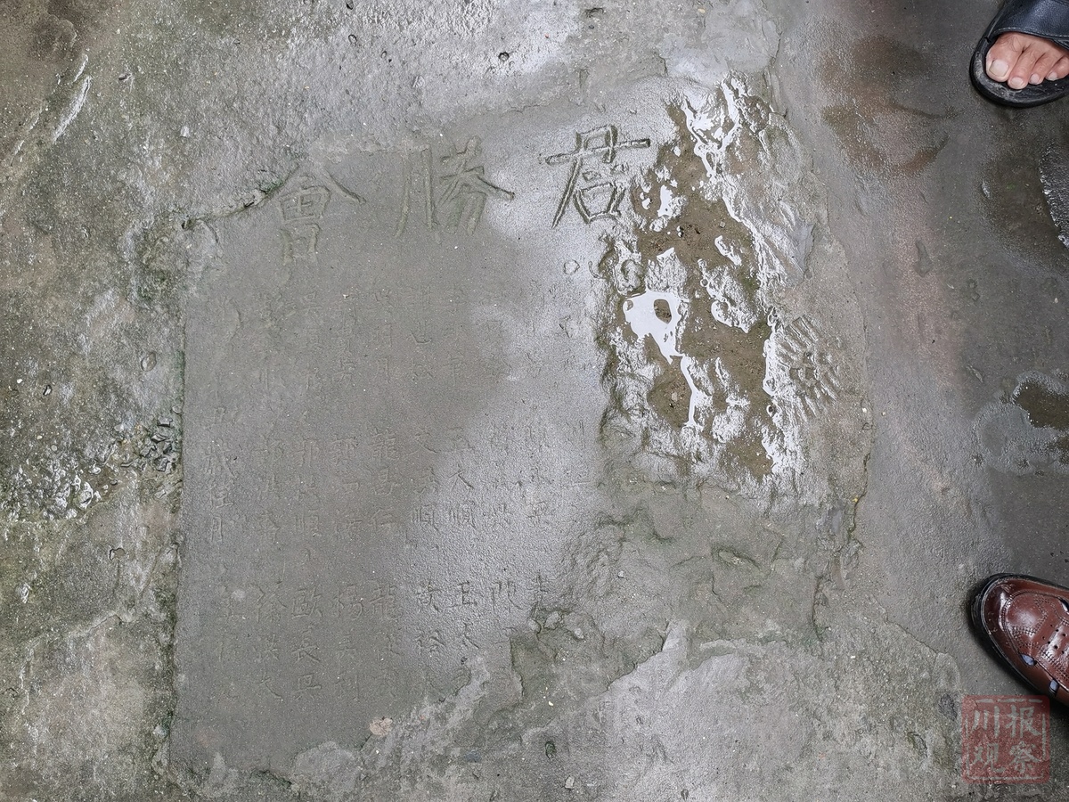 在街上行走时,当地百姓热心把我们带到了一块铺在石板路中间的断裂石碑前,“这个应该是老家什!”经过辨认,石碑上赫然可见“光绪辛丑年”“君胜会”等字迹。王昌文告诉记者,这应当是当年这里帮会立的修路碑,后来被用于铺了场镇道路。