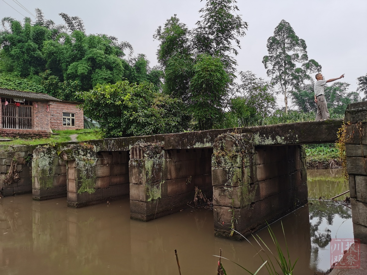 走出太平场外,可见一座石桥横卧溪流之上。石桥不长,桥身石桥却厚近一尺,桥身两侧还雕刻了龙头龙尾。虽然龙头龙尾已被破坏,但残留的雕刻还很精美,让人得以想象曾经的雄姿。王昌文说,石桥一侧曾经还有一通修桥碑,记载是清朝嘉庆年间修建了石桥,“从桥的体量规模和建造工艺来看,应该是官方修建。”