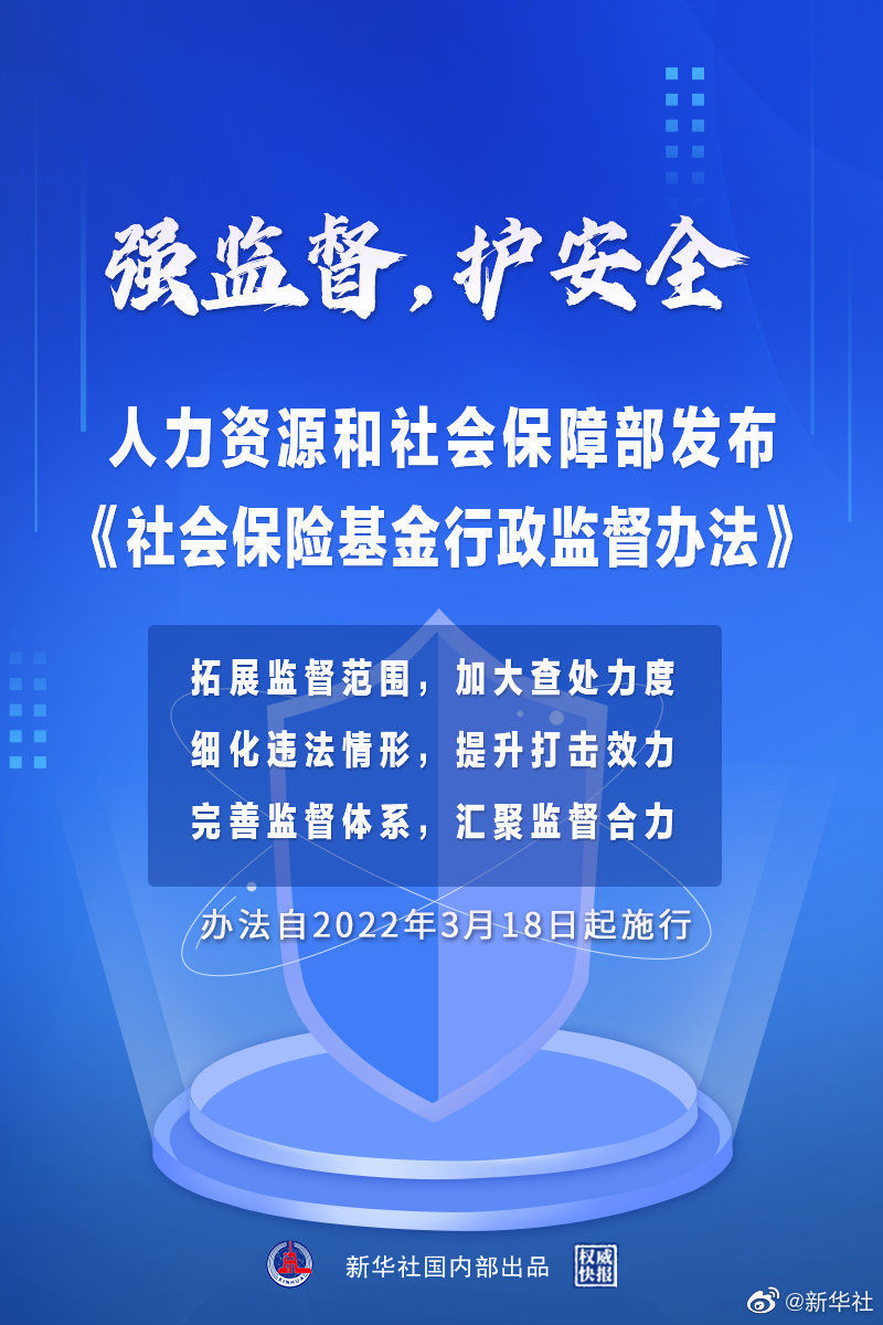 为提升监督效力、更好保障基金安全,人力资源和社会保障部2月22日发布《社会保险基金行政监督办法》,自3月18日起施行。人社部表示,下一步,将指导各地抓好办法的贯彻落实,强化监督查处,以零容忍态度严厉打击欺诈骗保、套保或挪用贪占社保基金的违法行为;同时开展全险种社保基金专项检查,发现一起、查处一起,努力守护好社保基金安全。(记者姜琳)