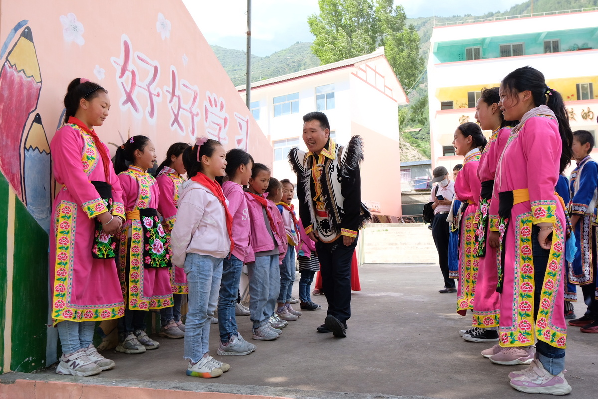 在松潘县小姓乡中心校读5年级的共金见措,在学校兴趣班学习了3年的多声部民歌演唱,现在已经学会7首原汁原味的多声部民歌。而教他们的特聘教师,正是泽旺仁青。“这个地方我们的声音要掉下去哦,再唱‘则诺’……”泽旺仁青目前带24个学生,学习藏羌多声部民歌,松潘县小姓乡中心校也是当地少数系统性地开设藏羌多声部民歌兴趣班的学校。