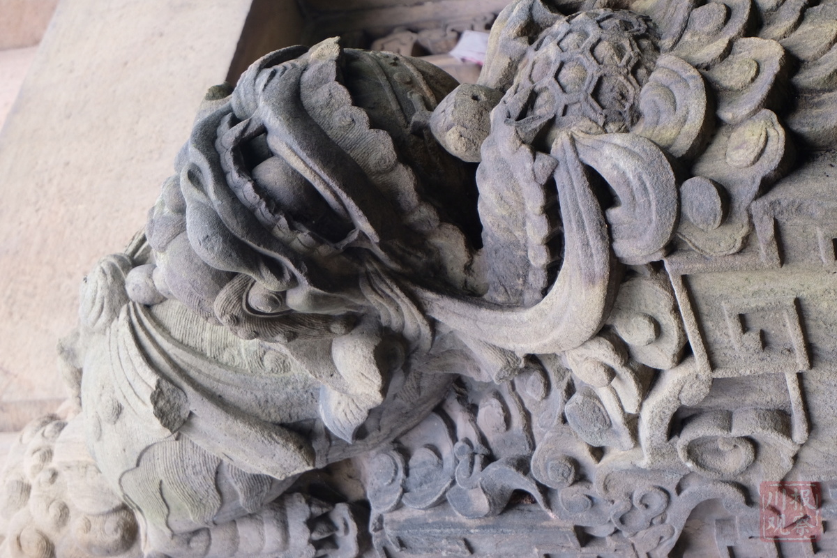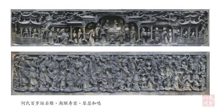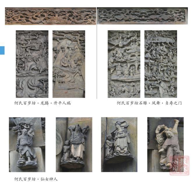 该牌坊高 11.7 米,宽 7.88 米,四角八翘巧夺天工,醒目的 4 根石柱构成了牌坊的三道门,正中是大门,两边是小门,门之间塑有栩栩如生的青狮、白象、麒麟等吉祥动物。正面刻有川渝高官恭贺名录及“升平人瑞”四个大气,背面刻有翰林刘宇昌篆书的何氏百岁坊序和“贞寿之门”四个大字。