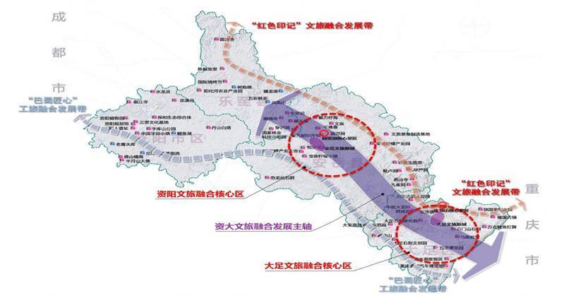 “两带”:“红色印记”文旅融合发展带。以红色旅游为主题,串联陈毅故里、饶国梁纪念馆等红色景点,发展红色研学、光辉农场、党史教育等红色文旅产业。“巴蜀匠心”工旅融合发展带。依托资阳、大足两地特色产业,串联资阳牙谷特色小镇、大足五金产业园等平台,发展工业旅游和创意、制作、体验等业态,促进工旅融合发展。