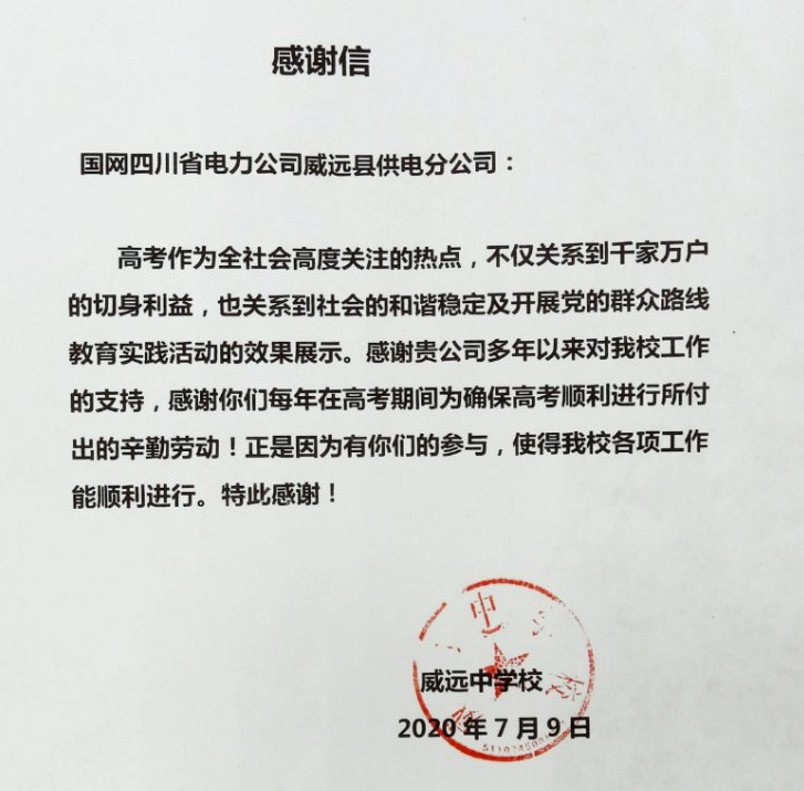 “感谢你们为确保高考顺利进行所付出的辛勤劳动!……”7月9日,一封来自威远中学的感谢信为国网内江供电公司高考保电工作打出了高分。