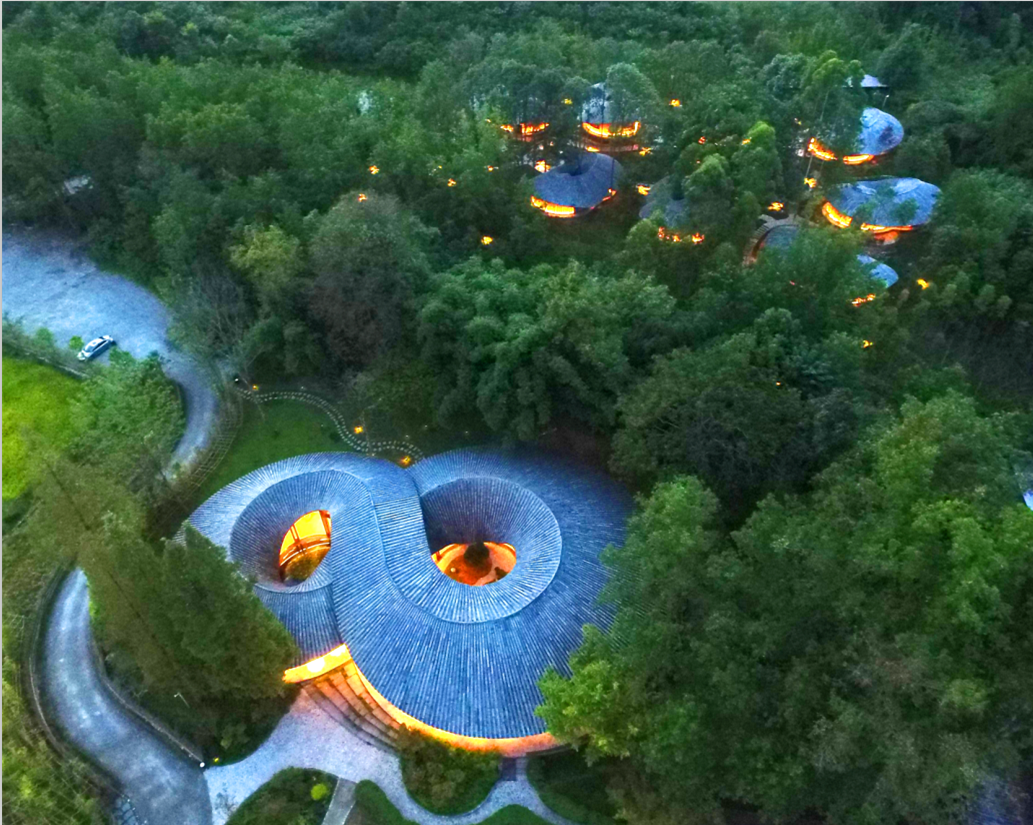 竹艺村中最吸引人的,是一个叫作“竹里”的建筑。从空中俯瞰,这个建筑的外形类似“无限(∞)”这个符号。这栋建筑还曾亮相当代国际展示艺术的最高展会——威尼斯建筑双年展。竹里的名字取自南宋诗人陆游的一首诗《太平时》:竹里房栊一径深,静愔愔。乱红飞尽绿成阴,有鸣禽。临罢兰亭无一事,自修琴。铜炉袅袅海南沉,洗尘襟。