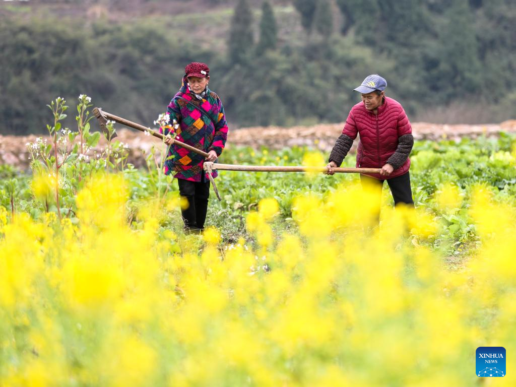 Villagers work in a field in Xindian Town of Yuping Dong Autonomous County in Tongren City, Guizhou Province, Feb. 21