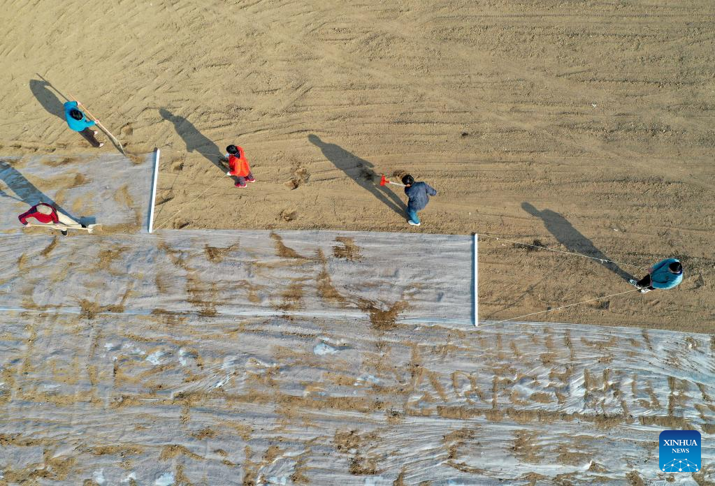 Aerial photo taken on Feb. 21, 2022 shows villagers covering the herbs they grow with mulch in Weili Village , Bozhou, Anhui Province.