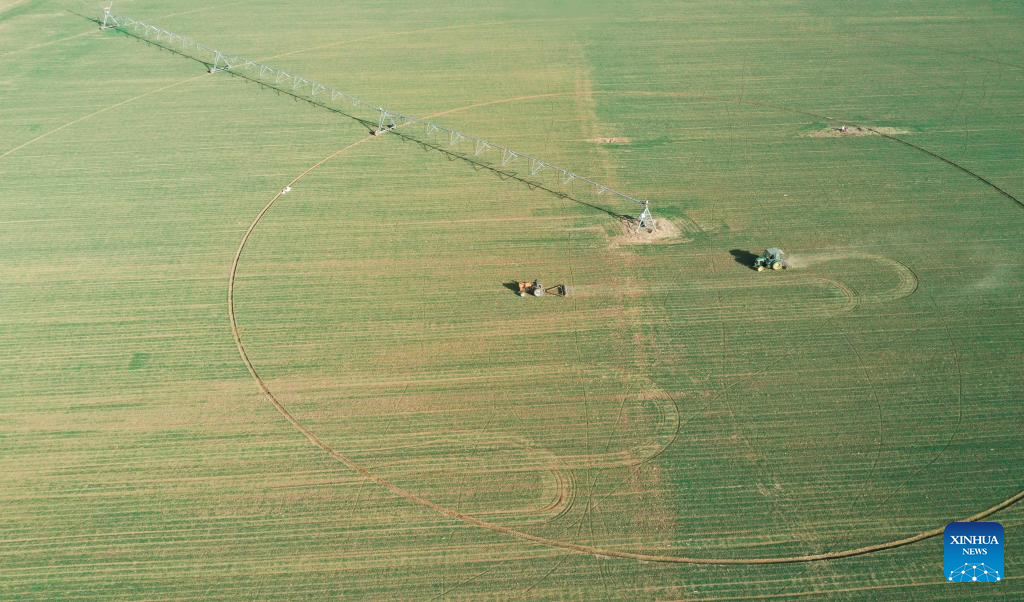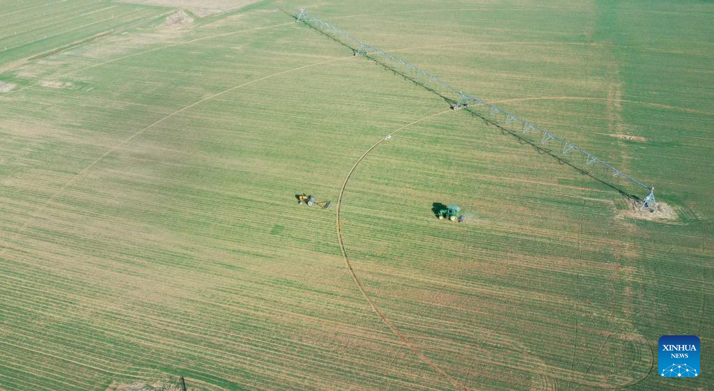 Aerial photo taken on Feb. 21, 2022 shows farmers working in a field in Zouping City, east China's Shandong Province. Farming activities are in full swing across the country.