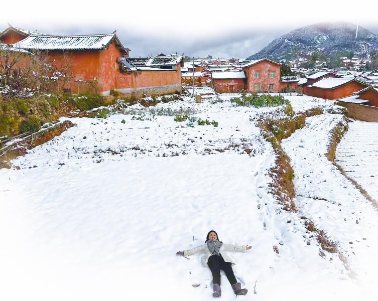 2月22日,攀枝花市民在大雪覆盖的中国历史文化名村迤沙拉玩雪,这里白雪红墙,美不胜收。 潘芝 摄