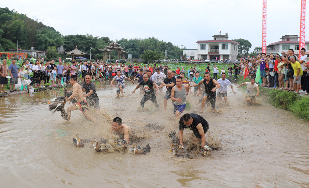 活动当天,分主会场、分会场开展了各种形式的趣味活动。除了主会场精彩的文艺表演,设在藕花洲景区的分会场也吸引了众多游客的参与。不仅有优雅的旗袍秀、书画作品展,“荷里戏鱼”、“稻田飞鸭”等趣味比赛也“收割”了不少欢呼声和惊叫声。