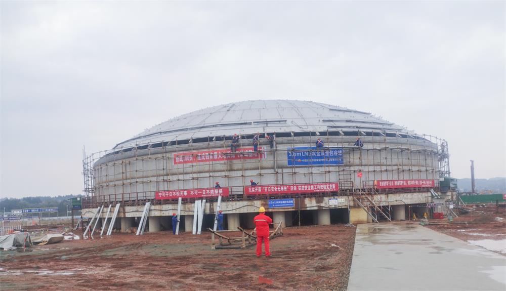 项目全面投产后将实现6万立方米LNG应急储备能力,满足川中地区上游气源故障时3天的需求量,实现每天96万标准立方米调峰能力,满足川中地区及周边500千米范围内的点供市场调整需求。目前项目一期穹顶骨架安装完成,穹顶板开始下料,抗压环安装完成,外罐底板安装及焊接完成,事故污水池基坑已完成验槽。