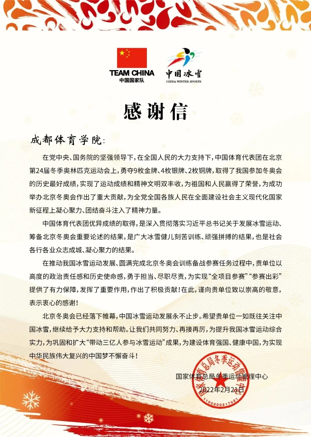 川观新闻记者2月23日获悉,国家体育总局冬季运动管理中心日前向成都体育学院发来感谢信,感谢成都体育学院助力中国体育代表团在本届冬奥会摘金夺银创造历史最好成绩,为实现“全项目参赛”“参赛出彩”提供了有力保障,发挥了重要作用,作出了积极贡献。