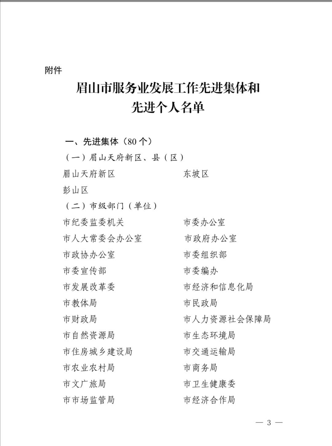 为树立榜样、表彰先进,眉山市委、市政府决定,对全市范围内从事服务业发展工作的先进集体和先进个人予以表彰。