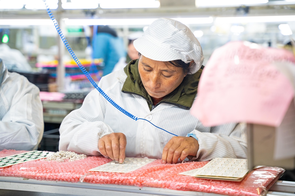 四川欧莱德精密电子有限公司生产车间内,工人正在生产线上忙碌,加紧赶制订单。