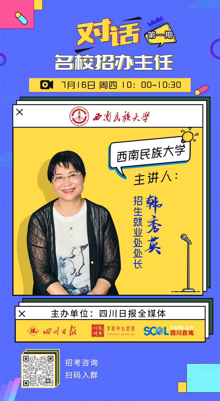 7月16日,由四川日报全媒体集群重磅推出的“后浪们,高校招办主任‘拍了拍’你”2020高校招生咨询大直播第二场开启。西南民族大学招生就业处处长韩秀英作为嘉宾做客直播间,详细为广大准备报考西南民大的考生和家长答疑。