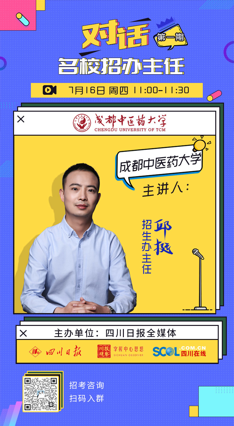 7月16日,由四川日报全媒体集群重磅推出的“后浪们,高校招办主任‘拍了拍’你”2020高校招生咨询直播第二场开启。成都中医药大学招生办主任邱挺作为嘉宾做客直播间,为考生和家长解读成都中医药大学今年招生政策,解答网友问题。