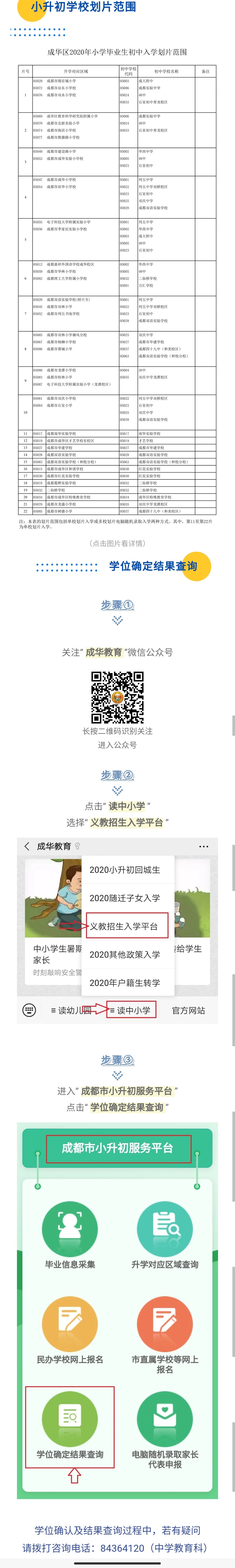 7月15日,记者从成都市成华区教育局获悉,成华区2020年小学毕业生初中入学划片范围公布,请家长于18-19日登录“成都市小升服务平台”进行公办、民办学位最终确认(具体操作步骤附后),21-24日按初中学校安排到校报道。