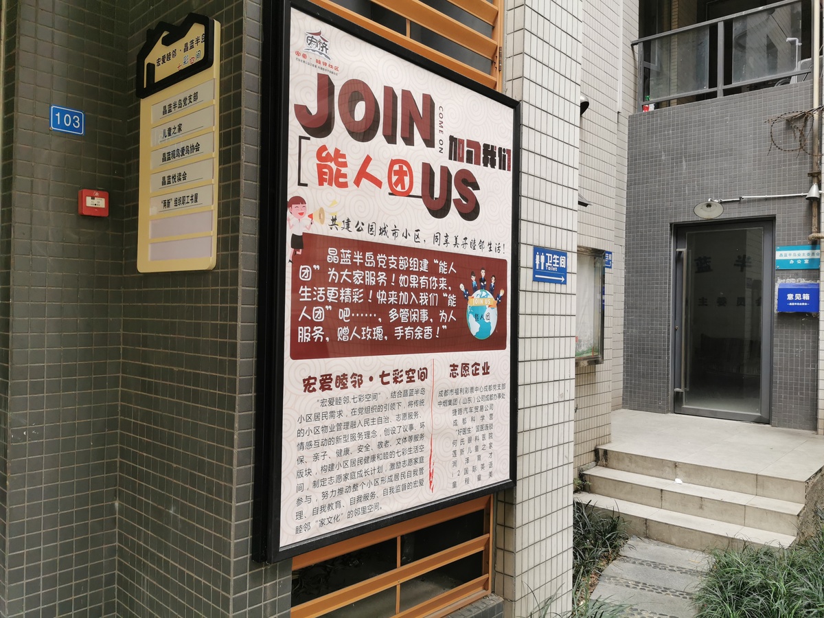 “晶蓝半岛党支部组建‘能人团’,一起‘多管闲事’、为人服务,快来加入吧……”在晶蓝半岛的小区“七彩空间”门口,有这样几句标语。