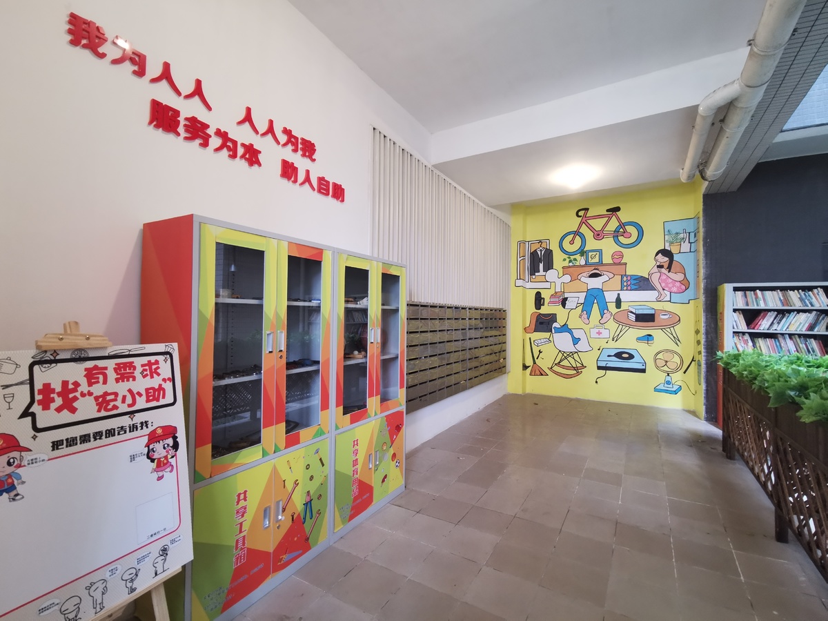 该小区联合物业,将楼栋负一层约500平方米的闲置空间改造成乒乓球馆、棋牌室、图书室等文娱活动阵地,为居民提供了一处展示运动、书法、绘画、摄影等才艺的邻里空间,同时,该小区诞生了不少文体活动队伍;利用架空层打造为“共享空间”,搭建名为“宏小助”的线上线下互帮互助平台,筹集居民家中闲置的劳动工具、图书、玩具、婴儿车、手推车等物品,提供给全体业主共享。
