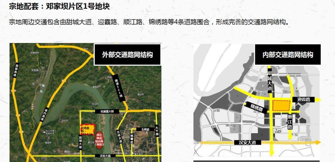 该地块位于临近商业中心沱江沿岸,周边由甜城大道、迎霞路、顺江路、锦绣路等4条道路围合,具备完善的交通路网。同时还拥有万达广场、内江国际会展中心、内江市第一人民医院等商业、医疗配套,充分保障区域生活需求。