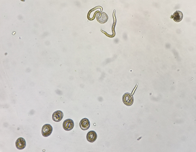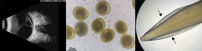 随后,两个团队通过实验室血清学检测很快证实了该猜测。男孩血清中含大量的犬弓首蛔虫特异性IgG阳性抗体,其水平(74.82单位)远超正常临界值(正常临界值0-9);同时,男孩眼防水中也检查到较高水平的犬弓首蛔虫特异性IgG抗体(58.53单位,正常临界值0-32)。为了进一步确诊,研究者对男孩家中宠物狗进行了寄生虫检测和驱虫处理,粪检和寄生虫形态学结果确证了该犬存在严重的犬弓首蛔虫感染,从而确诊男童患白瞳症眼弓蛔虫病(见下图)。经手术和抗炎治疗30天后,男童出院,但是在随访的6个月中,其右眼视力并未得到明显改善。