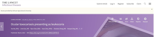 川观新闻记者2月25日从四川农业大学获悉,动医学院动物寄生虫病研究中心谢跃副教授与中山大学中山眼科中心丁小燕教授团队合作撰写的病例报道《Ocular toxocariasis presenting as leukocoria(表现为白瞳症的眼弓蛔虫病)》在国际顶尖医学期刊《The Lancet Infectious Diseases(柳叶刀-感染病学)》(影响因子25.071)上发表。谢跃为本论文第一作者,四川农业大学为第一单位;中山大学丁小燕教授为通讯作者。