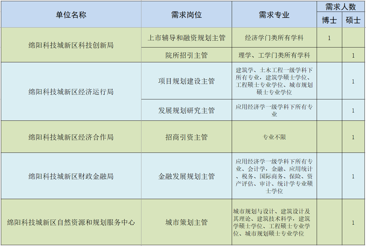 据了解,此次招聘的范围主要是面向国内“双一流”建设高校和境外著名大学(指发布公告时最新ARWU、QS、THE三大世界大学排名均位于前100名的境外大学,且境外硕士研究生学制需两年及以上)招聘人才。用人单位为绵阳科技城新区的科技创新局、经济运行局、自然资源和规划服务中心等5家单位。涉及岗位主要有院所招引主管、招商引资主管、城市策划主管等7个。