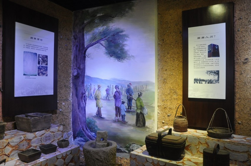 洛带客家博物馆中陈列客家移民迁徙图及生活用品。(图片来源:洛带古镇)