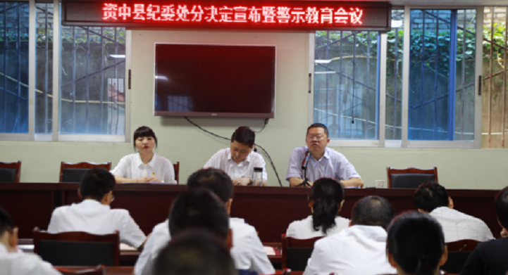 “党的工作纪律,关系到党组织和党员的工作作风和工作效率,是党组织和党员开展各项工作的重要保证……”7月15日,一场不同以往的警示教育在资中县龙结镇政府一楼会议室进行,该县纪委监委审理室主任华丽宣读了该镇干部钟某某、王某某因违反党的工作纪律被给予党内警告的处分决定。