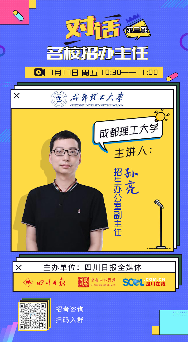 7月16日,由四川日报全媒体集群重磅推出的“后浪们,高校招办主任‘拍了拍’你”2020高校招生咨询直播第二场开启。成都理工大学招生办副主任孙亮作为嘉宾做客直播间,为考生和家长解读成都理工大学今年招生政策,解答网友问题。