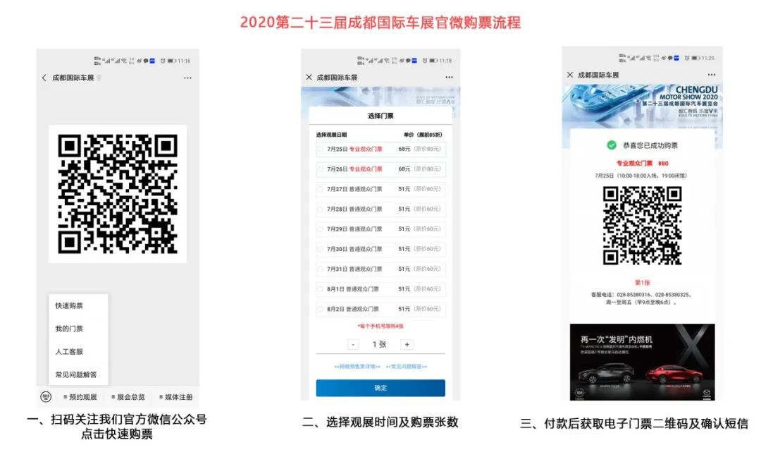 1、微信搜索关注“成都国际车展”或扫描下方官方微信二维码,点击菜单栏“预约观展”快速购票,购票成功自动获取电子门票二维码。即日起至7月23日24时, 购门票享85折优惠。
