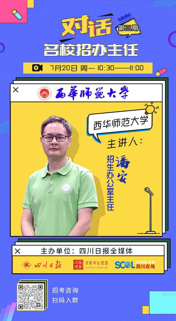 7月20日,由四川日报全媒体集群重磅推出的“后浪们,高校招办主任‘拍了拍’你”2020高校招生咨询直播第四场开启。西华师范大学招生办公室主任潘安作为嘉宾做客直播间,为考生和家长解读西华师范大学今年招生政策,解答网友问题。