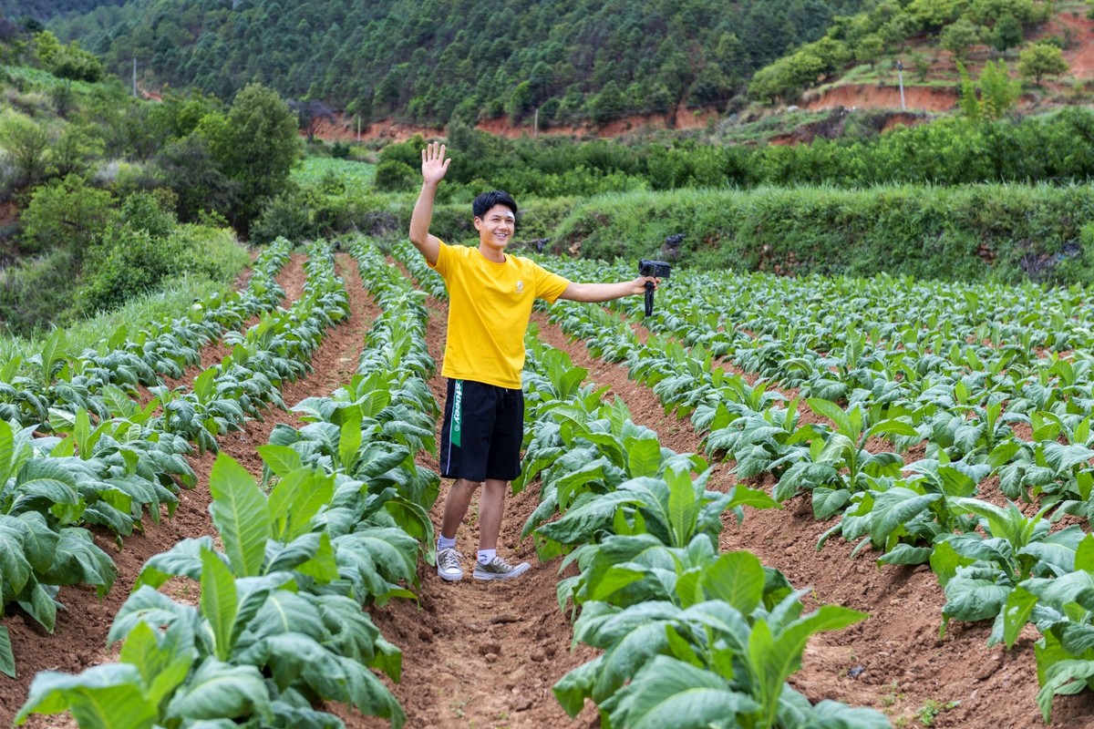 “大家好,我是小高,地里的烤烟已经撕膜了,现在我来带大家看看烤烟长多高了吧!”7月8号一大早,大龙潭乡干坝子村第一书记姜波来到脱贫户高邦能家中的烤烟地里,远远地望见高邦能举着相机在拍摄自家的烤烟。