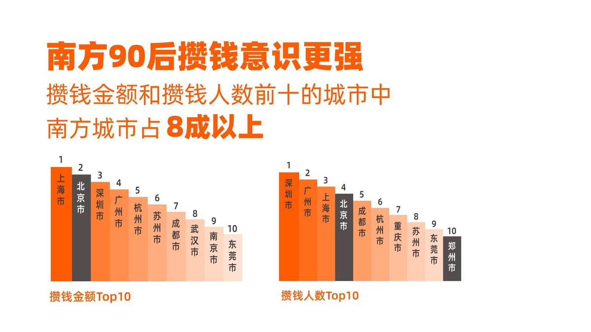 南方人精打细算的性格也反映到了攒钱上。报告显示,90后攒钱金额和攒钱人数前十的城市中,南方城市占8成以上。其中,成都90后攒钱人数在全国排名第五,攒钱金额全国排第七。