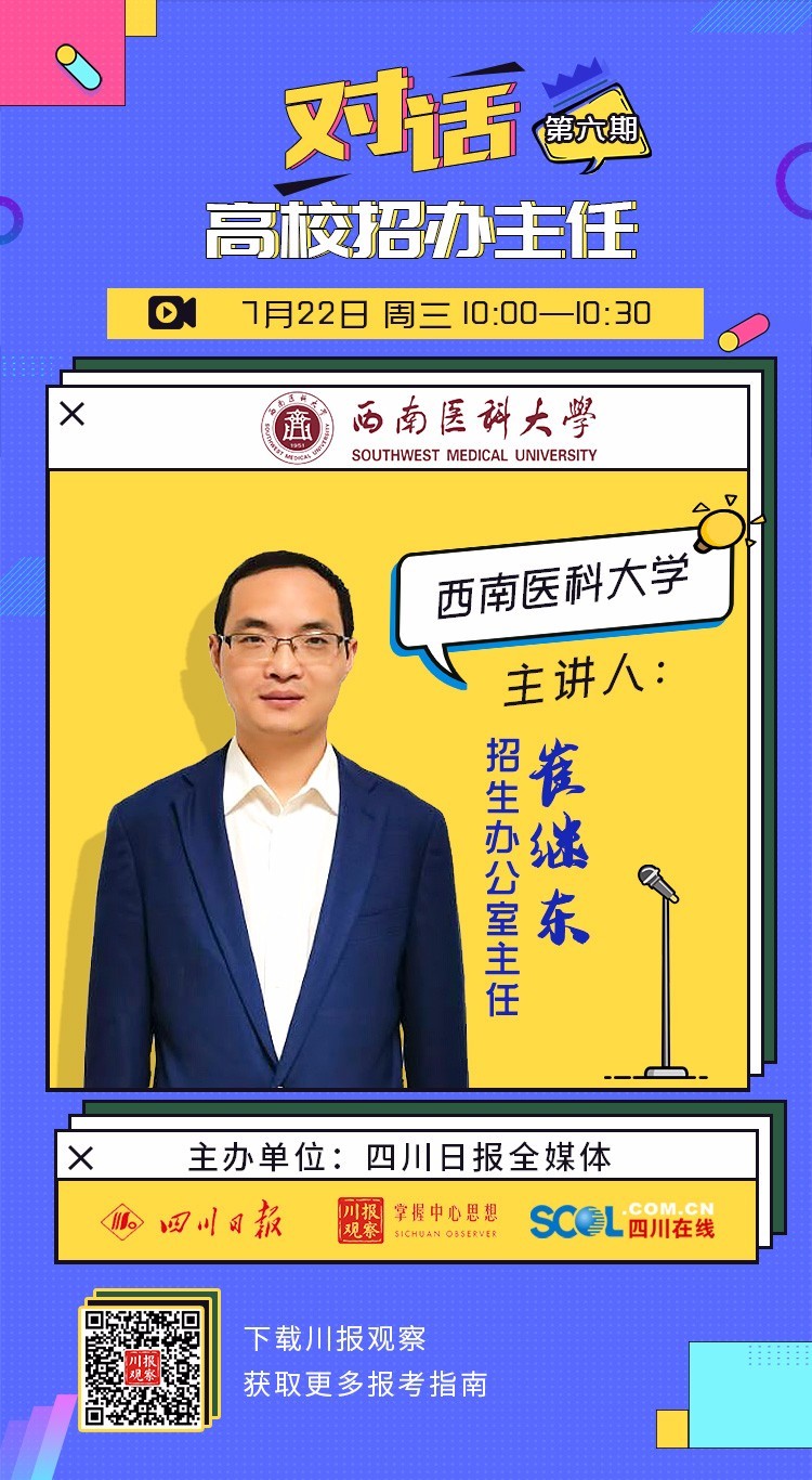 7月22日,由四川日报全媒体集群重磅推出的“后浪们,高校招办主任‘拍了拍’你”2020高校招生咨询直播第六场开启。西南医科大学招生办公室主任崔继东作为嘉宾做客直播间,为考生和家长解读西南医科大学今年招生政策,解答网友问题。