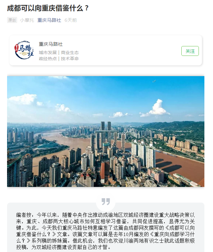 该公号运营者陈卜文说,在收到成都网友的这篇投稿后,“我们非常兴奋,这体现了重庆、成都两地网友的一种良性互动。所以我们将这篇文章与去年10月编发的《重庆向成都学习什么?》系列稿称为姊妹篇。”