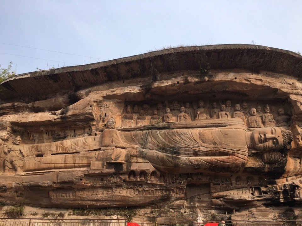 另一尊卧佛,便是大足石刻宝顶山的释迦涅槃圣迹图。这是一尊宋代凿刻的右卧半身佛像,也是全世界最大的石雕半身卧像。大佛全长31米,同样慧眼微闭,安祥而卧。然而,近千年来,大足卧佛风化严重,再加上酸雨腐蚀,表面彩绘颜色几乎全部脱落,右侧众弟子像中,迦叶像也已不见踪影。去年,大足石刻文物保护团队已开启卧佛的保护修缮,预计在2023年将恢复卧佛的历史风貌。