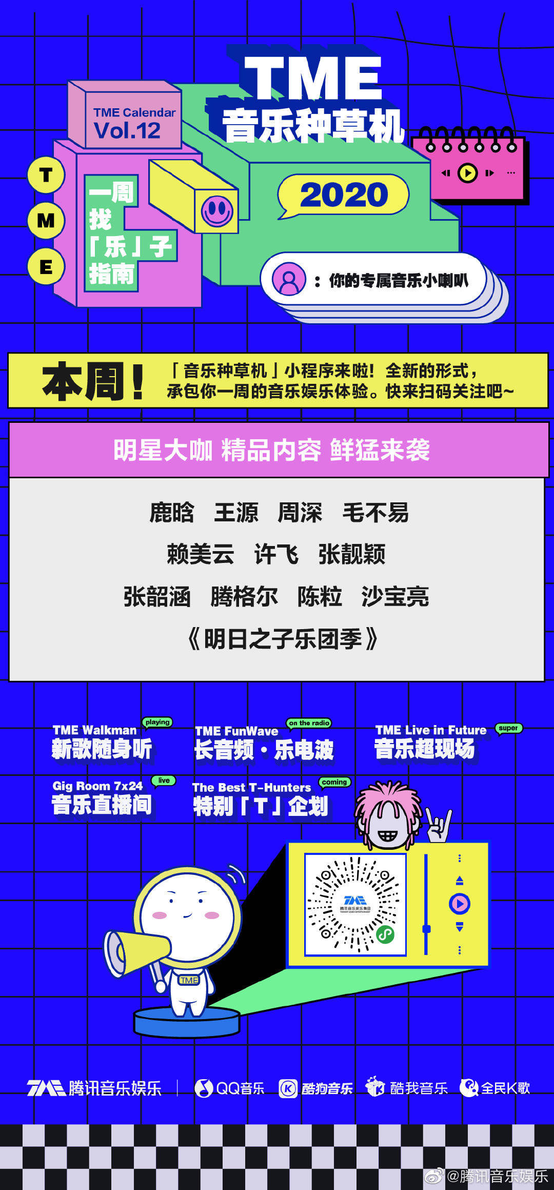 本周腾讯的音乐种草机,为大家推荐了鹿晗、王源、毛不易、许飞、张韶涵等人的音乐作品和音乐现场,感兴趣的朋友可扫描下方小程序码。了解更多内容。