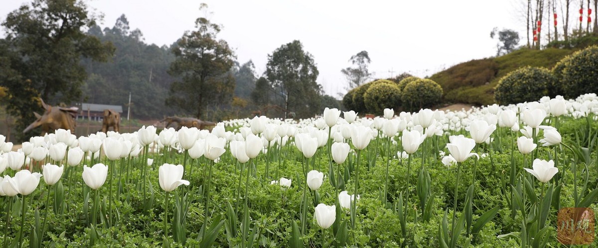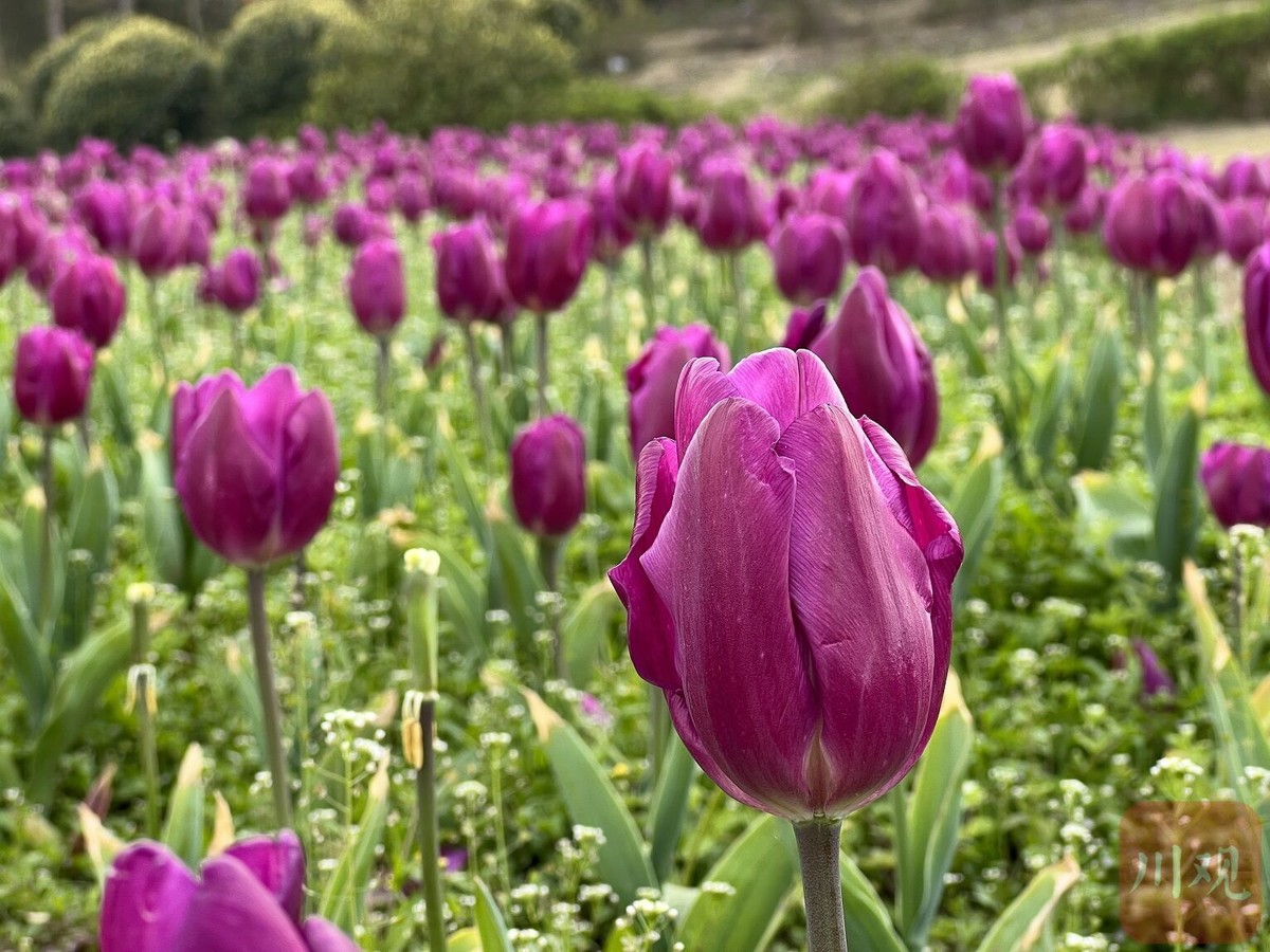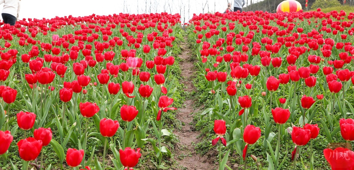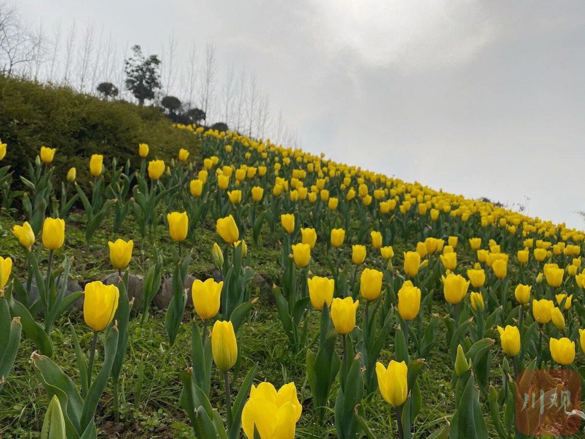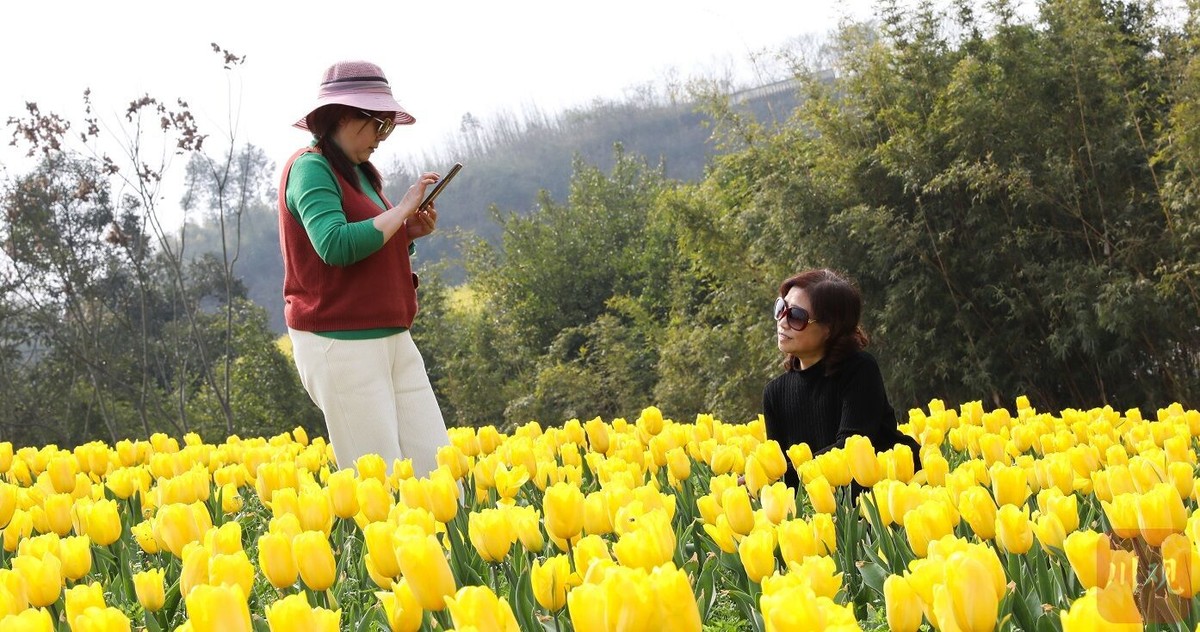 近日,气温回暖,春光灿烂,自贡沿滩区永安镇观音湖景区,上万株各色郁金香竞相绽放,引得游客们纷纷用相机捕捉春色,共赏浪漫郁金香花海。