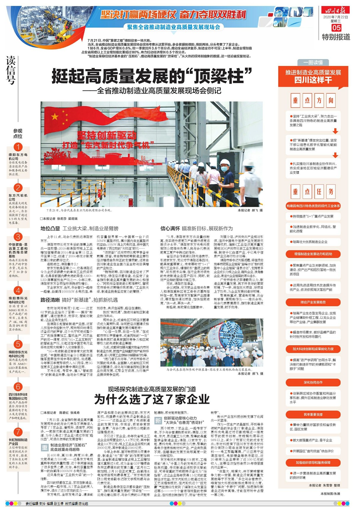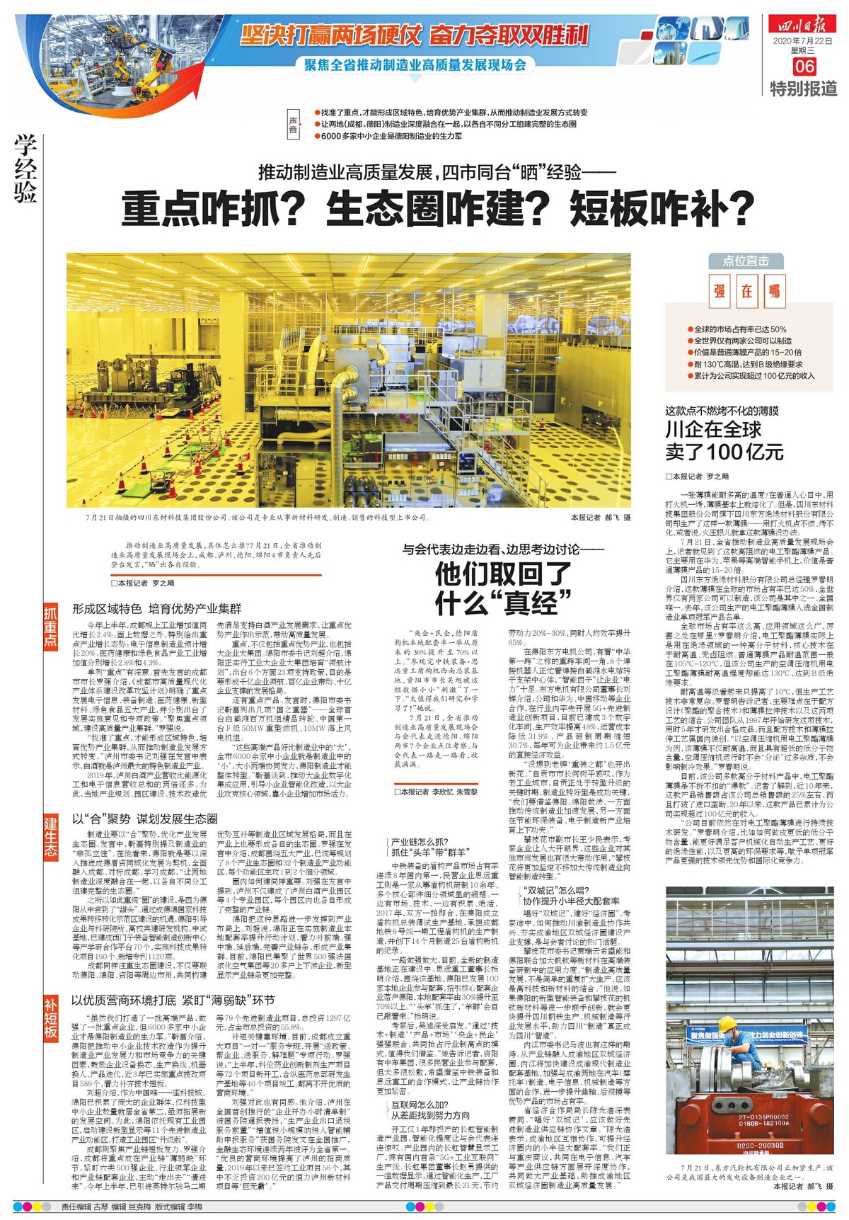 7月22日四川日报一版、五版、六版“全省推动制造业高质量发展现场会”报道拼图。
