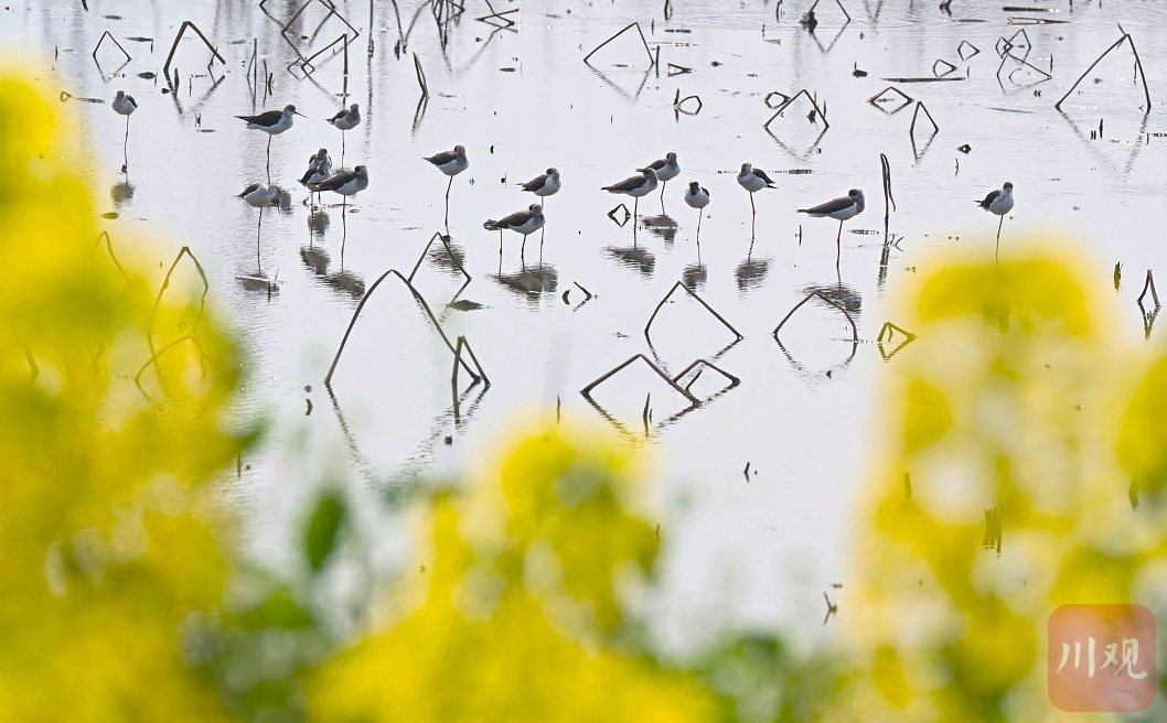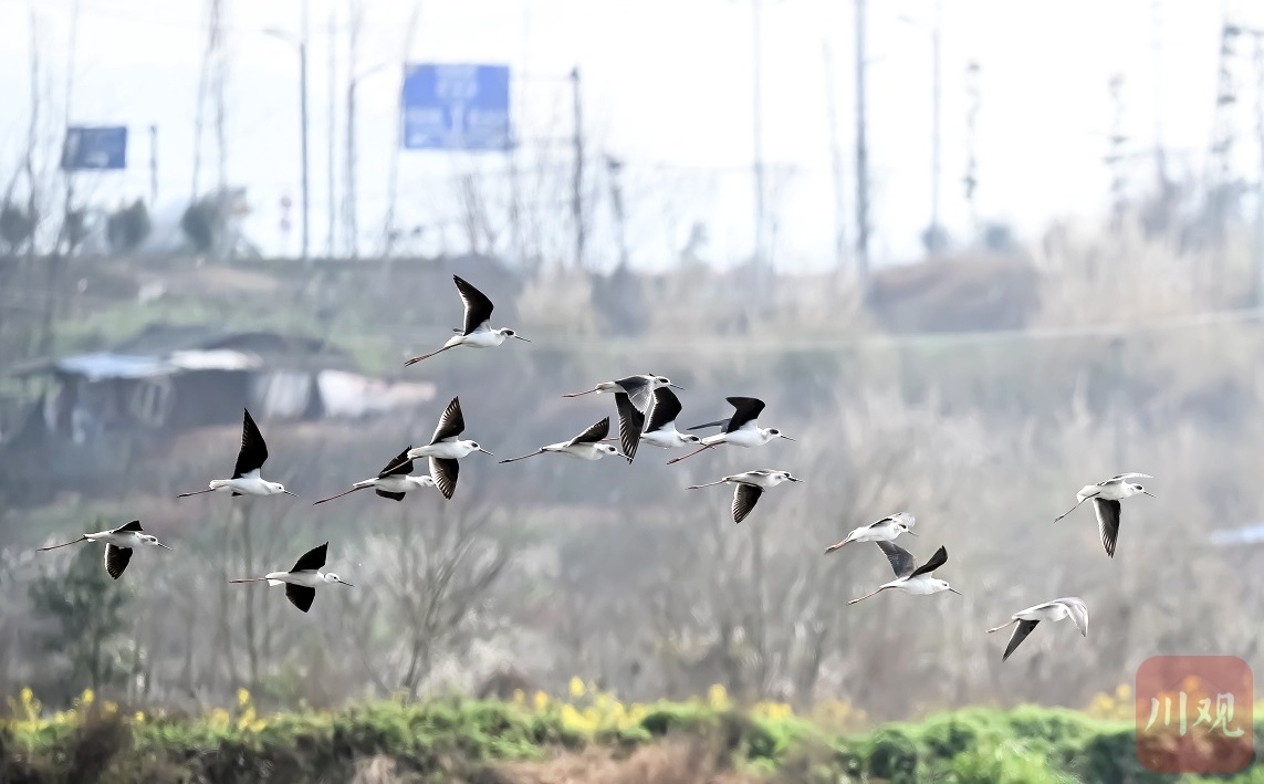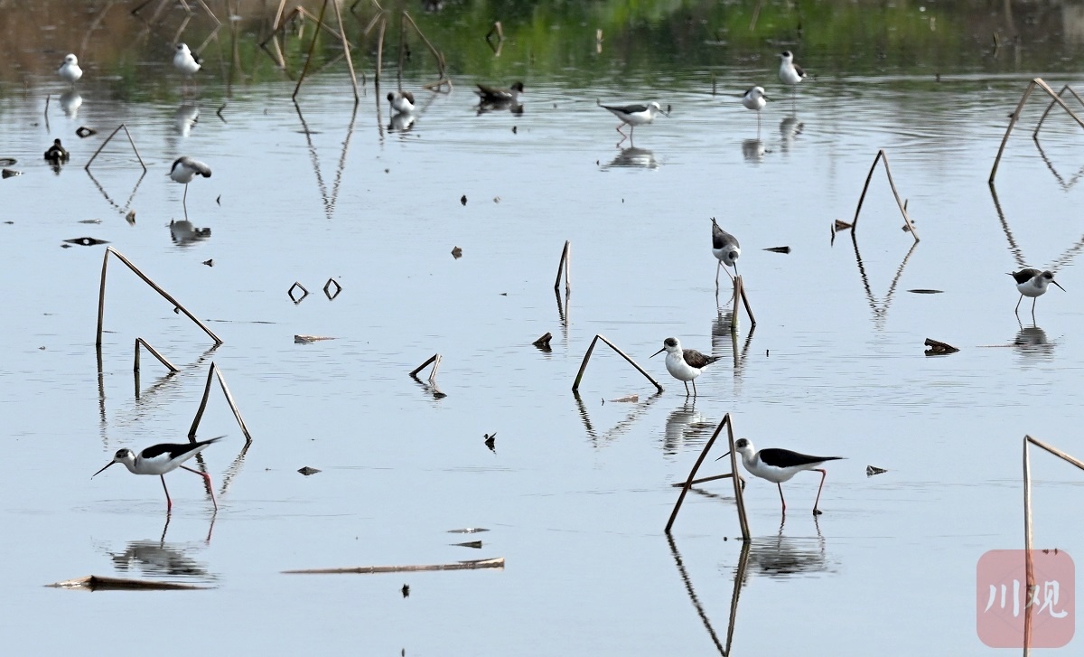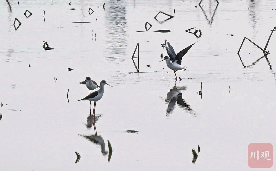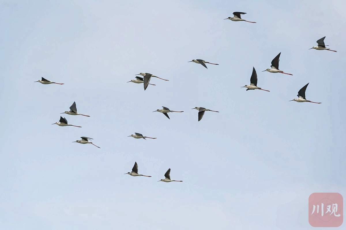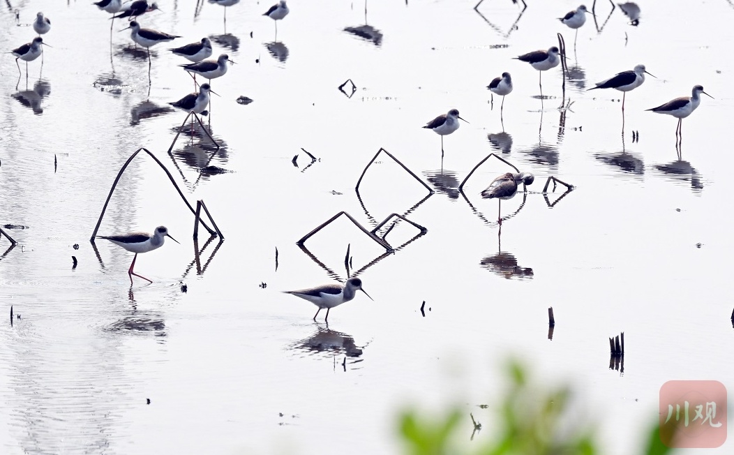 近日,一群黑翅长脚鹬(yù)在北迁途中飞到了成都市青白江区姚渡镇凉水村,它们在荷塘里觅食、嬉戏,成为春天里的一道美丽风景线。