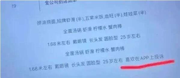 “1.68 左右,戴眼镜,长头发,圆脸型,25 岁左右,喜欢在 app 上投诉。”近日,海底捞被爆料私下在点单机器上给会员“打标签”。爆料信息显示,店方在会员资料上备注有顾客的身高、年龄、发型、脸型等体貌特征以及个人喜好等,另外还有“喜欢在APP投诉”字样的记录。该网友认为此举侵犯了消费者的个人隐私。