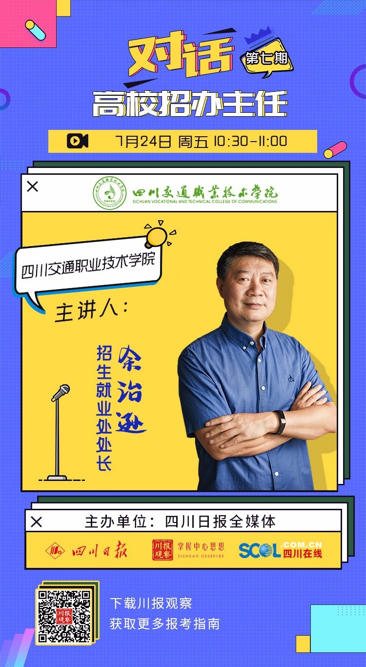 7月24日,由四川日报全媒体集群重磅推出的“后浪们,高校招办主任‘拍了拍’你”2020高校招生咨询直播第七场开启。四川交通职业技术学院招生就业处处长余治逊作为嘉宾作客直播间,为考生和家长解读四川交通职业技术学院今年招生政策,解答网友问题。