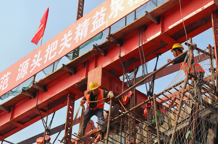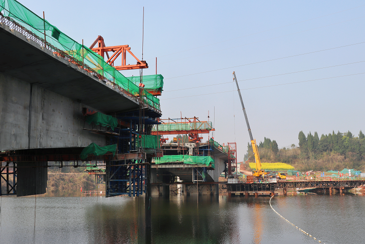 3月3日上午,在内江东兴区顺河镇,内江至大足高速公路项目联合水库大桥项目工程施工现场,工地上焊花飞溅,工程车辆来回穿梭,数十名工人正在进行桥梁上部结构施工。