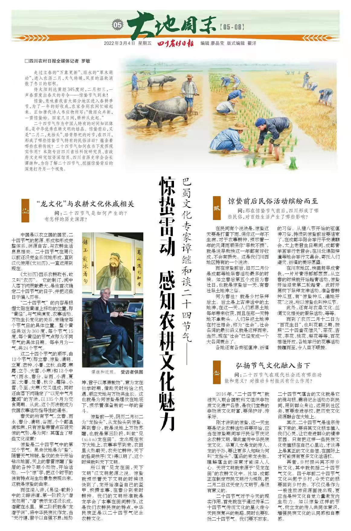 刚才讲到的惊蛰,这一天主要是纪念农耕活动将要开始,应当在惊蛰期间举行民俗节庆纪念农耕文明,借此宣传中华民族龙文化。华夏儿女是龙的传人、龙的子孙,要让更多人知晓为何叫“龙抬头”,蕴涵的来龙去脉,理解蕴含的深意才能深入人心。天府文明就来源于“见龙在田”的农耕文化中。比如,成都正在制定市民文明行为规则,把二月二日这天定为文明节,是很有意义的。