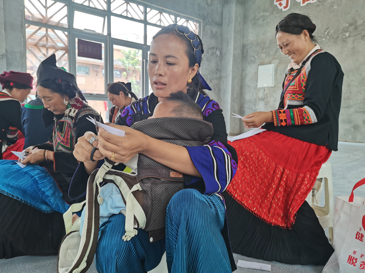 为何背着娃娃参加培训?勒格吉克莫说,近段时间正是花椒成熟期,前几天她老公带着另外3个孩子回山上老家收花椒去了。而这个3个月的娃娃还没断奶,所以得一直由她照顾,但她一点儿也不觉得辛苦。