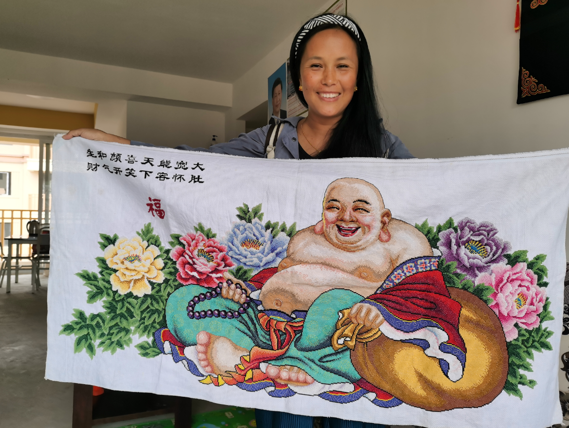 其实,和大多数彝族妇女一样,勒格吉克莫从小就和长辈们学习彝绣,但从未接受过正规的教学,主要靠自己琢磨。“虽然以前我也能绣出一些衣服、饰品,但只能自家人穿戴,不能作为商品卖成钱。”在沐恩邸社区的新家里,她向记者展示了她曾经制作的一幅名为《福》的彝绣作品,画面栩栩如生。